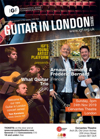 Add to my Calendar 24-11-2019 15:00 24-11-2019 17:00 36 Guitar In London During 2019 we present young talent as well as more established guitarists from around the world, including many UK debuts as well as premieres of new commissioned work. The venue is the beautiful, intimate Cervantes Theatre located in an exciting, rapidly developing part of London, south of the river.This concert features the What Guitar Trio (UK), with special guest Laura Snowden, and the guitar duo of Arnaud Dumond and Frédéric Bernard (France), playing music composed by Arnaud Dumond. Cervantes Theatre, London DD/MM/YYYYDetails