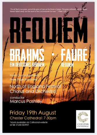 Following a triumphant concert of the Verdi Requiem in 2019, the North of England Festival Chorus and Orchestra return to Chester Cathedral, for a performance of the beautiful and moving Brahms and Fauré Requiems. Nearly 150 singers from all over the UK and Europe, join together to present this concert, the culmination of the Chester Choral Week. With professional orchestra and soloists performing these memorable works, this is a concert not to be missed.
