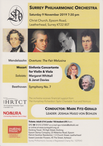 The Surrey Philharmonic Orchestra peform Mendelssohn, Beethoven and Mozart. Margaret Whittall (violin) and Janet Davies (viola) are the soloists in Mozarts's Sinfonia Concertante.