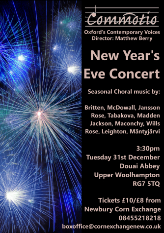 Commotio is delighted to return to the stunning acoustics of Douai Abbey for their biennial New Year's Eve concert. Performing the very best contemporary choral music, and reviving neglected choral gems, Commotio will perform their favourite seasonal repertoire. From Britten's 'Christ's Nativity' (a rarely performed suite pre-dating the better known 'A Boy is Born') to Mantyjarvi's ' Christmas Eve 1913' and McDowall's 'Cradle Song' (both written in 2017) this is a concert packed with superb music to see out 2019.