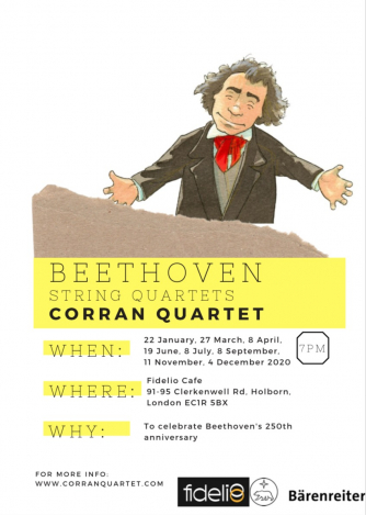 Add to my Calendar 08-07-2020 19:00 08-07-2020 21:00 36 Beethoven Quartets As part of the global celebrations of the birth of Ludwig van Beethoven, the recently formed Corran Quartet are including his 16 quartets in their concert programmes throughout 2020 and 2021. After playing together in different chamber music formations, we decided to dedicate ourselves to string quartet and have since been studying at MusicWorks courses, playing concerts in London and planning concerts and school workshops around the country. Fidelio Orchestra Cafe, London DD/MM/YYYYDetails