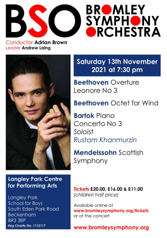 Our season opens with Beethoven at his grandest – Leonora Overture No. 3 – followed by Beethoven at his most intimate – his wind octet. Then the gifted Rustam Khanmurzin plays the folksong inspired Third Concerto for piano by Bartók. Mendelssohn’s scintillating Scottish symphony wraps up the concert with a Celtic flourish!