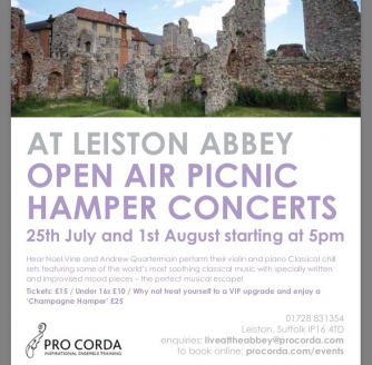 Join Noel Vine (violin) and Andrew Quartermain (piano) for an open air concert in the ruins of Leiston Abbey complete with picnic hamper as they perform tracks from their album Classical Chill VOL 1, plus music from Max Richter, Elgar, Philip Glass and more