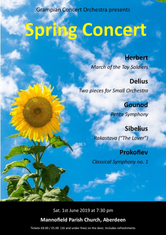 Add to my Calendar 01-06-2019 19:30 01-06-2019 21:30 36 Spring Concert Grampian Concert Orchestra, conducted by Tim Tricker, present a spring concert including Prokofiev's 'Classical' Symphony. The programme also features 'On Hearing the First Cuckoo in Spring' by Delius, Rakastava by Sibelius, the Petite symphonie by Gounod and Herbert's 'March of the Toy Soldiers'. Mannofield Church, Aberdeen DD/MM/YYYYDetails