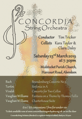 Add to my Calendar 23-03-2019 19:30 23-03-2019 21:30 36 Concordia String Orchestra Tim Tricker conducts Concordia String Orchestra for their spring concert. They are joined by the cellists Kara Taylor and Clara Daley to perform the Vivaldi Double Cello Concerto in G minor. The first half also includes Tartini's Sinfonie in A and Bach's Brandenburg Concerto No. 3. The second half features a double bill of Vaughan Williams - the Charterhouse Suite is followed by the Fantasia on a Theme by Thomas Tallis. Midstocket Parish Church, Aberdeen DD/MM/YYYYDetails