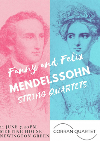 In the iconic Meeting meeting in Newington Green, recently lovingly restored to its former beauty, the Corran Quartet present 2 works from the Mendelssohn family: Fanny and her brother Felix. The Meeting House is appropriately famous for being "the birthplace of feminism", so here is a rare opportunity to hear 2 fabulous pieces of music by the Mendelssohn siblings.