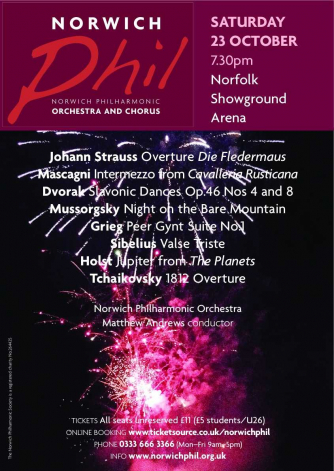 Having not given a live public concert since February 2020, the Norwich Philharmonic Orchestra is delighted to be back on the concert stage presenting a celebratory programme of popular orchestral classics at the Showground Arena on Saturday 23rd October at 7.30pm, conducted by Matthew Andrews. Tchaikovsky’s 1812 Overture, complete with cannon and mortar effects tops the bill, and tickets have been pegged to just £11, with a special price of £5 for any young person under 26.