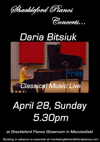 Add to my Calendar 28-04-2019 17:30 28-04-2019 19:30 36 Classical Piano Concert Daria Bitsiuk plays Chopin, Beethoven, Debussy, an Evans song, Kapustin and Liebermann. Shackleford Pianos, Macclesfield DD/MM/YYYYDetails