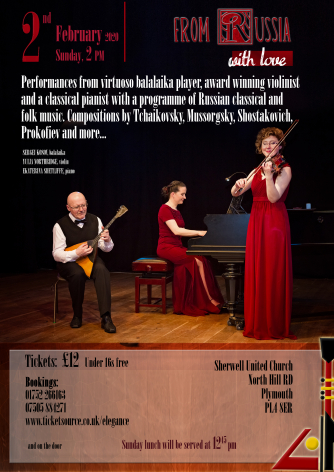 Our concert series this year will feature performances from our popular trio - virtuoso balalaika player Sergei Kosov (Gnesin Academy of Music, Russia), award winning violinist Yulia Northridge (Petrozavodsk Music Academy, Russia) and concert pianist Ekaterina Shetliffe (Dargomizsky College of Music, Tula, Russia) presenting a new programme by Sergei Rachmaninov, Modest Mussorgsky, Dmitry Shostakovich, Peter Tchaikovsky, as well as arrangements of popular Russian folk songs.