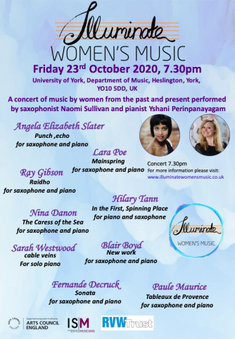 Add to my Calendar 23-10-2020 19:30 23-10-2020 21:30 36 Illuminate York Join us for an evening of music new and old by women composers performed by Yshani Perinpanayagam and Naomi Sullivan Illuminate Women's Music Sir Jack Lyons Concert Hall, York DD/MM/YYYYDetails