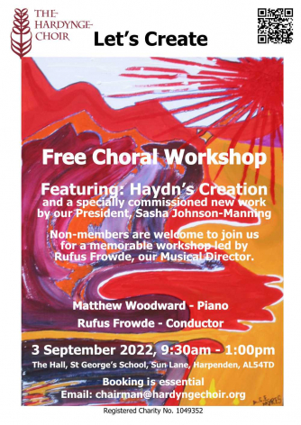 Add to my Calendar 03-09-2022 09:30 03-09-2022 11:30 36 Let’s Create Non-members are welcome to join us for a memorable workshop led by Rufus Frowde, our Musical Director. Music scores and light refreshments will be provided. Booking is essential at [email protected]. St George's School, Harpenden DD/MM/YYYYDetails
