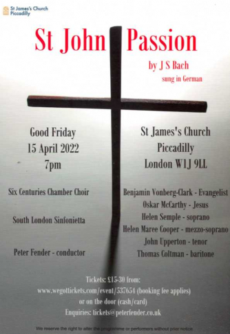 We perform the St John Passion, as it was intended, on Good Friday. Bach's telling of, and reflection upon, the story of the end of Jesus' life, through combinations of solo singers, choir and orchestra, is unparalleled in its emotional power.