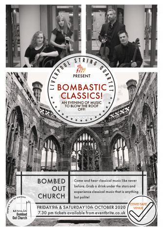 Add to my Calendar 09-10-2020 19:30 09-10-2020 21:30 36 Liverpool String Quartet at the Bombed Out Church The Liverpool String Quartet bring you an evening of music that will change what you thought you knew about classical music! Come grab a drink, sit under the stars and hear why this music is anything but polite. This explosive music doesn’t need a backing track, and it certainly doesn’t need black tie! Come hear the sound of four musicians playing classical music that will make you want to jump up and dance, music that will break your heart and music that will make your heart race! Clap when you like, drink when you can and discover a new world of music at the Bombed Out Church. St Luke's Bombed Out Church open - air venue creates the perfect COVID safe venue, so come dressed for the occasion and bring blankets if you wish. St Luke's Bombed Out Church, Liverpool DD/MM/YYYYDetails