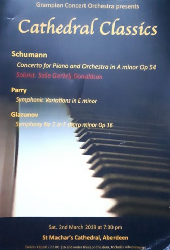 Add to my Calendar 02-03-2019 19:30 02-03-2019 21:30 36 Cathedral Classics Tim Tricker conducts the Grampian Concert Orchestra for Parry's Symphonic Variations and Glazunov's Symphony No. 2. They are joined by Sasa Gerzelj-Donaldson who will perform Schumann's Piano Concerto in A minor. St Machar's Cathedral, Aberdeen DD/MM/YYYYDetails