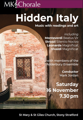 Add to my Calendar 16-11-2019 19:30 16-11-2019 21:30 36 Hidden Italy An evening of Italian Baroque music, art and readings, featuring relatively unknown music by 17th century Italians Isabella Leonarda and Barabara Strozzi alongside favourites from Vivaldi and Moneverdi. Associated readings and the projection of art from the period will complement the music. St Mary & St Giles Church, Milton Keynes DD/MM/YYYYDetails