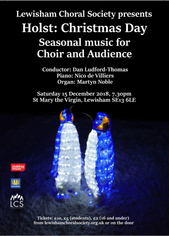 Add to my Calendar 15-12-2018 19:30 15-12-2018 21:30 36 Holst: Christmas Day LCS presents a sparkling selection of music for the festive season. Our programme includes Gustav Holst’s Christmas Day, a choral fantasy on traditional carols, along with joyful music both new and old for choir and audience. Join us for mince pies and wine at St Mary the Virgin, Lewisham, and start your Christmas celebrations in style! St Mary the Virgin Church, London DD/MM/YYYYDetails