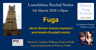 Add to my Calendar 04-03-2020 13:10 04-03-2020 15:10 36 Lunchtime Recital with Fuga The opening recital in the Bristol Song Recital Series 2020 season, with some beautiful music for voice and violin. Lots of folk influences, shaped by some of the best arrangers of that style ever. Free entry to Bristol's magnificent city centre church! St Stephen's Church, Bristol DD/MM/YYYYDetails