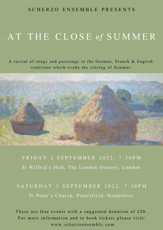 On September 2nd, as the summer draws to an end, Scherzo Ensemble will visit St Wilfrid's Hall, Kensington to present a recital of songs and partsongs selected along the theme of the changing season. The collective will perform vocal quartets and solo art songs in the German, French & English traditions each evoking the close of summer.