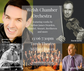 Add to my Calendar 13-06-2019 19:30 13-06-2019 21:30 36 Welsh Chamber Orchestra The Welsh Chamber Orchestra is joined by violinist David Juritz and Welsh baritone Jeremy Huw Williams to perform well loved classical works and the second orchestral performance of 'i sleep alone', a specially comissioned work by Nathan James Dearden. Torch Theatre, Milford Haven DD/MM/YYYYDetails