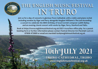Join us for a day of concerts in glorious Truro Cathedral, with a violin-and-piano recital including sonatas by Elgar and Parry alongside Vaughan Williams’s The Lark Ascending; a concert to celebrate the 80th birthday of local Cornish composer Judith Bailey; and an evening choral concert with works by Elgar, Parry, Stanford and Tallis.