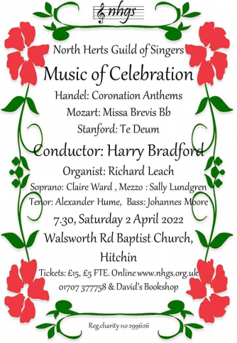 Add to my Calendar 02-04-2022 19:30 02-04-2022 21:30 36 Music of Celebration The concert features Handel’s Coronation anthems, commissioned for the coronation of King George II, which represent some of his most vivacious and musically satisfying writing. The set is most known for the infamous ‘Zadok the Priest’ a favourite of classical audiences and football crowds alike but it is perhaps in the other anthems where Handel’s exquisite counterpoint and melodic capabilities come to the fore. The Coronation anthems are paired with Stanford’s majestic Te Deum in B flat, orchestrated for the coronation of Edward VII in 1902, and Mozart’s exuberant Missa Brevis in B flat - a charming piece that combines intuitive musical design with characteristic Mozartian flair and wit. Walsworth Road Baptist Church, Hitchin DD/MM/YYYYDetails